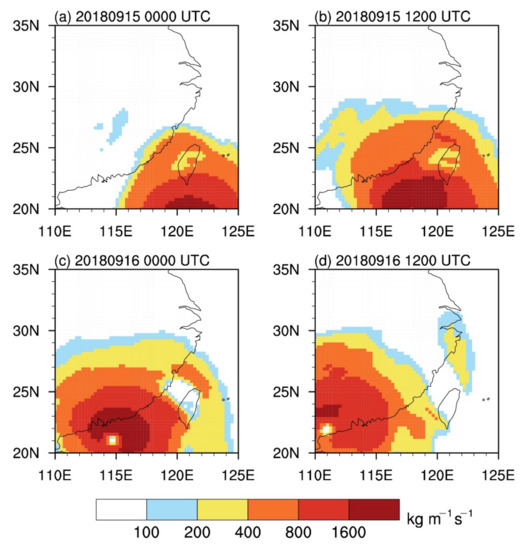 From 0:00 on 15 September to 12:00 on 16 September, Typhoon Mangkhut moved in the west–north direction under the influence of the air flow guided by the southwest side of the subtropical high pressure [30]. The center of the typhoon moved from 18.1° N, 120.7° E to 22° N, 111.6° E. From Figure 5, we can see the change in the whole-layer water vapor transport disturbance during the typhoon movement. At 0:00 on 15 September, the center of the typhoon was located in the eastern part of the Bashi Channel. Due to the topography of the Central Mountains in Taiwan Island, the southeast airflow of the Bashi Channel reached Taiwan Island and was blocked by the mountains, forming a southeast jet with the maritime subtropical high pressure, heading toward East China and transporting water vapor to the area [18]. Precipitation occurred on the southeastern side of the Taiwan Island Mountains, and the water vapor was blocked. The water vapor transport value of the whole layer decreased in the central part of Taiwan Island, forming two high value areas in the south and north (Figure 5a). At 12:00 on 15 September, as the typhoon continued to move northwestward, a sub-maximum water vapor transport area was formed in northern Taiwan Island, with a maximum value exceeding 800 kg/m/s (Figure 5b).