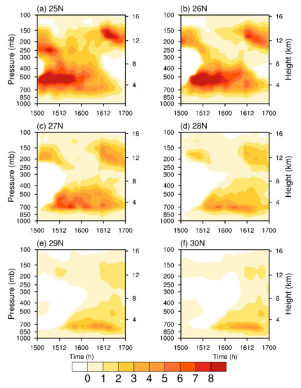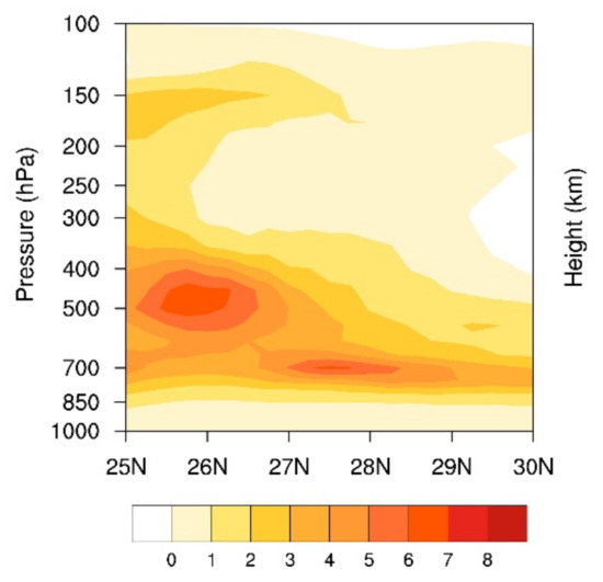 Additionally, there was an obvious horizontal propagation in this high-value area, extending from 25° N to 28° N, and there was a significant decrease around 28° N, from over 150 hPa to around 200 hPa. At the same time, it can be seen that, at 25° N, there was more than two times the amount of water vapor transport at 150–200 hPa, and, at 26° N, the water vapor transport area was more than six times larger at the height of 500 hPa. This height was near the 0-degree layer, which may provide suitable conditions for the growth of graupel [44,45]. It may also promote multiplication, which is the dominant mechanism for the increase in the concentration of ice-phase particles [44,46]. From 25° N to 30° N, the maximum magnification height of water vapor transport decreased from 500 to 700 hPa, indicating that there was an obvious falling process when water vapor was transported from the east side of Taiwan Island to the north. The abnormal value of water vapor transport below 700 hPa decreased rapidly, because the height below 700 hPa corresponds to the traditional water vapor transport height, and the average value of water vapor transport at this height was very large. Even if the typhoon has a high wind speed, the magnification of the typhoon will not be extremely large. The water vapor conditions in the lower layers were similar, indicating that the collision and merging of the lower layers may be similar to the monsoon precipitation [47,48].
