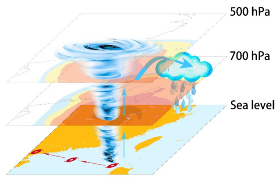 The long-distance precipitation of a typhoon usually refers to precipitation occurring about 1000 km away from the center of the typhoon [11]. Some studies have pointed out that topography plays an important role in such precipitation [12,13]. The specific topography of a region can promote the uplift of warm and humid air, causing adiabatic cooling and condensation and thereby enhancing precipitation, which is mostly short-term heavy precipitation [12,13,14,15,16]. The combination of frontal systems and tropical cyclones can also lead to heavy precipitation over long distances. Tropical cyclones provide water vapor transport, and frontal systems provide lift, with warm and humid air being lifted above dry and cold air. During the uplifting process, the water vapor in the air cools and condenses to cause rainfall, which is mostly continuous low-intensity rainfall, and creates large accumulated amounts of rainfall [17]. Furthermore, the upper-level jet system is also closely related to the long-distance rainfall of tropical cyclones. It can provide a better upper-level divergence for the development of local strong convections, thereby promoting the development of convection and causing local heavy precipitation [18,19]. Large-scale environmental variables, such as SST, vorticity, divergence and zonal winds, regulate the development of tropical cyclones and the priority areas for tropical cyclone occurrences, as well as having an important impact on typhoon-related long-distance heavy rainfall [20].