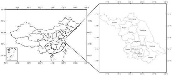 In this study, 13 prefecture-level cities in Jiangsu Province are taken as the research units. Data from the Jiangsu Statistical Yearbook 2019 and 2020 (http://tj.jiangsu.gov.cn/col/col80733/index.html, accessed on 1 March 2022) and the website of the National Bureau of Statistics (http://www.stats.gov.cn/, accessed on 1 March 2022), and the statistical bulletins of national economic and social developments of cities in Jiangsu (http://www.tjcn.org/tjgb/10js/, accessed on 5 March 2022) are used in the study. The 13 prefecture-level cities in Jiangsu are divided into three parts: southern Jiangsu (including Nanjing, Wuxi, Changzhou, Suzhou and Zhenjiang), central Jiangsu (Nantong, Yangzhou and Taizhou) and northern Jiangsu (Xuzhou, Lianyungang, Huai’an, Yancheng and Suqian).