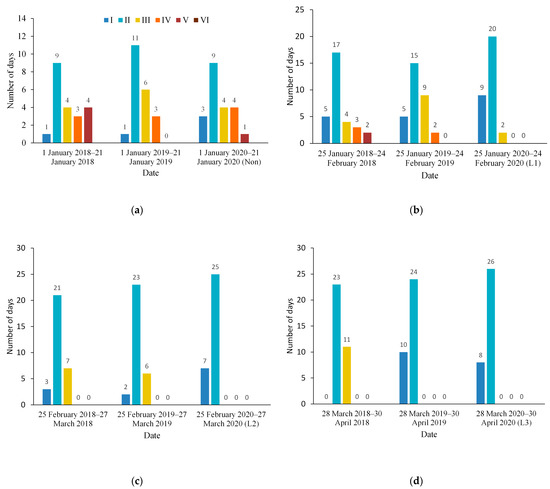 The number of days for each grade of air quality under different pandemic prevention and control levels in Jiangsu Province ((a), Non; (b), L1; (c), L2; (d), L3).
