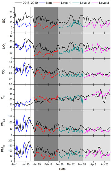Compared with the temporary control during major events and meetings in recent years, the control of COVID-19 pandemic is the strictest in history in both time and space. Therefore, it is possible to systematically study the impact of strict control measures implemented by the government on air quality. In recent years, some scholars have studied the impact of temporary control measures on urban air quality during major events or conferences, such as the 22nd Asia-Pacific Economic Cooperation Economic Leaders’ Meeting in Beijing [5], the 2013 Asian Youth Games [6] and 2014 Summer Youth Olympic Games in Nanjing [7], and the 2016 G20 Hangzhou summit [8]. The variations of air quality during these events demonstrate that the control measures are highly effective in alleviating air pollution.