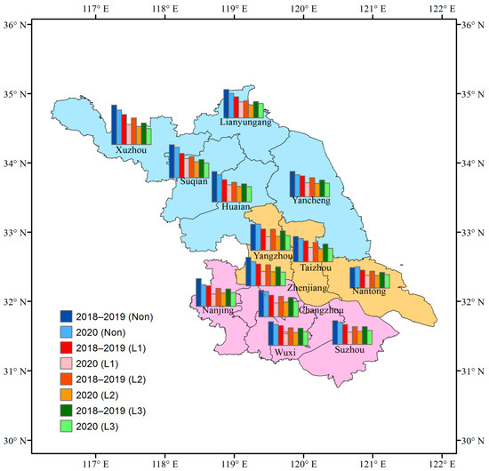 The GDP of 13 cities from 2019 to 2020 is shown in Table 5. The GDP of cities in southern Jiangsu is relatively higher. For example, the GDPs of Suzhou and Nanjing in 2020 reached CNY 2017.05 billion and CNY 1481.795 billion, respectively, while the GDPs of cities in northern Jiangsu were relatively lower. Suqian, the city with the lowest GDP in the province, had a GDP of CNY 326.24 billion in 2020. From the perspective of industrial structure (Figure 6), the proportion of primary industry in northern Jiangsu is higher than the average level of the whole province, while the proportions of secondary and tertiary industry are lower. The situation is the opposite in southern Jiangsu [35]. Under the epidemic prevention and control measures, the industrial and vehicle emissions were limited, so the secondary industry represented by industry and the tertiary industry represented by service industry were greatly affected. Therefore, the southern Jiangsu, dominated by the secondary and tertiary industries, was more sensitive to the PPC measures.
