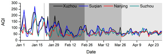 The daily variations of AQI in Xuzhou, Suqian, Nanjing and Suzhou in 2020 are presented in Figure 5. It can be seen that before the outbreak of COVID-19, the air quality in southern Jiangsu (Nanjing and Suzhou) was relatively good, while the air quality in northern Jiangsu (Xuzhou and Suqian) was poor. After the implementation of the first-level PPC measures, the air quality improved significantly. After the resumption of production, the pollutant concentrations rebounded, and the differences in the air quality among different cities shrank. The cities in southern Jiangsu returned to the pre-pandemic situation more quickly.