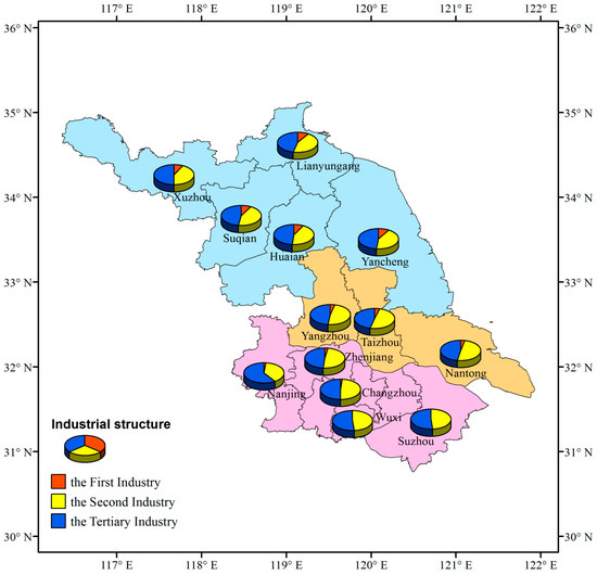 Industrial structure distribution map of 13 cities in Jiangsu Province. The data are from the Jiangsu Statistical Yearbook 2020, http://tj.jiangsu.gov.cn/2020/nj20/nj2006.htm, accessed on 10 March 2022.