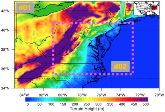 Terrain height of the area surrounding CB over the eastern U.S. The outer domain is denoted as d01 and the nest domain is enclosed within the pink dashed rectangle (d02). The insert map in the top-right corner shows the location of the study region (red shading) over the continental U.S. [40].
