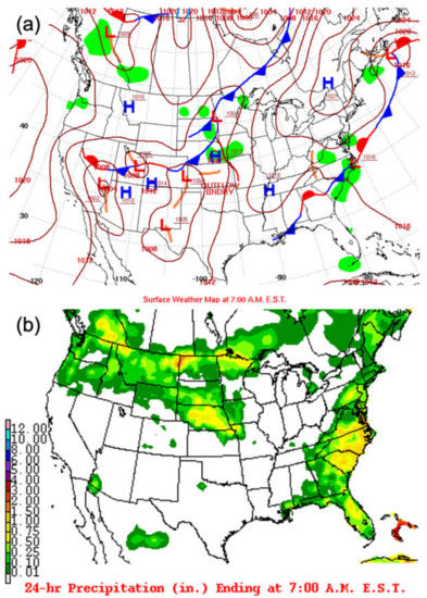 (a) Surface weather map at 7:00 AM EST (11:00 UTC) on 3 June 2015, with low-pressure systems and high-pressure systems indicated by L (red) and H (blue), respectively. (b) Map showing 24 h precipitation at 7:00 AM EST on 4 June 2015 (http://www.wpc.ncep.noaa.gov/dailywxmap/, accessed on 10 September 2020).