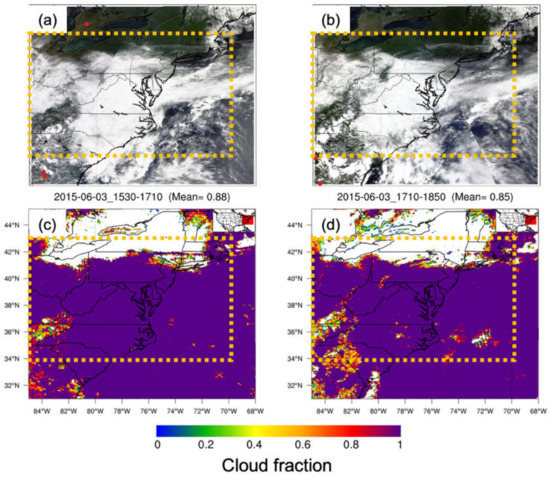 MODIS three-band color overlay images (band 1—red, band 4—green, and band 3—blue) from Terra (a) and Aqua (b) satellites on 3 June 2015. Red dots indicate the locations of daytime fires detected by MODIS. Note that the fire dot scale has been enlarged to portray the fires more clearly in the figure. Bottom images show MODIS cloud fractions from Terra (c) and Aqua (d). The orange dashed rectangle is the outer domain (d01).