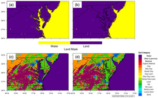 (a) WRF USGS land mask. (b) Same as (a), but modified water to land over CB. (c) WRF USGS 16 soil categories. (d) Same as (c), but modified water to loam over CB.