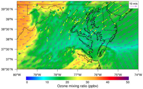 Tropospheric (ground-level or surface) ozone (O3) has significant environmental and human health impacts. Long-term exposure to high O3 concentration air leads to serious health issues, such as irritated lungs, aggravated bronchitis, emphysema, and asthma [1,2,3]. O3 also has significant impacts on crop yields, forest growth, and species composition [4]. Recent studies have focused on quantifying the impact of current O3 concentration on net ecosystem production as compared to the conditions of the pre-industrial era. [5,6]. To mitigate surface pollution in the U.S., the Clean Air Act requires the Environmental Protection Agency (EPA) to set National Ambient Air Quality Standards (NAAQS) [7]. The current NAAQS, in effect since 2015, sets an ambient 8 h O3 mixing ratio criterion of 70 parts per billion by volume (ppbv) [8,9]. In particular, the O3 mixing ratio over some coastal regions exceeds the NAAQS more frequently compared to other inland regions. Examples of such regions include the Chesapeake Bay (hereafter referred to as CB) [10,11], Galveston Bay [12], the Great Lakes [13,14,15,16], and the Great Salt Lake [17]. All these locations are in close proximity to water bodies surrounded by land, and related research is ongoing to investigate the causes of the exceedance of O3 concentration [11,18,19]. As a secondary pollutant, ground-level O3 depends on its precursors, chemical reactions, and meteorological conditions [20,21,22]. Understanding them helps to track O3 pollution sources and sinks and is critical for improving the accuracy of O3 pollution forecasting.