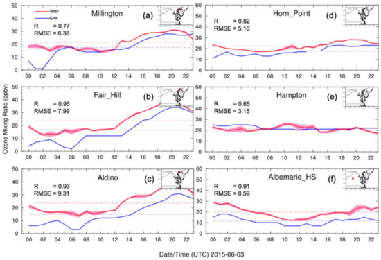 We investigated the hourly surface O3 mixing ratio diurnal evolution for the model and observations to evaluate the model performance on capturing the O3 diurnal variation. To compare the model simulation with the observations, the simulated O3 mixing ratios in nine 3 km × 3 km grids surrounding the AirNow station were aggregated to one 9 km × 9 km grid region and their means and standard deviations were calculated. Figure 6 shows hourly surface O3 mixing ratio diurnal variations from three AirNow stations (Millington, Fair Hill, and Aldino) close to the north of CB, two AirNow stations (Horn Point and Hampton) near the south of CB, and one AirNow station (Albemarie_HS) to the west of CB. As expected, the hourly surface O3 mixing ratio diurnal variation showed a lower O3 mixing ratio at night (around 10 ppbv at 0600 UTC; sunrise was at 1030 UTC), and a higher O3 mixing ratio in the daytime (around 30 ppbv at 2000 UTC; sunset was at 0000 UTC). During the night, the absence of sunlight and fewer O3 precursor (NOX, etc.) emissions prevented the required O3-forming chemical reactions from being initiated. The correlation coefficients (Rs) and root mean square errors (RMSEs) were 0.77, 0.95, 0.93 and 6.38, 7.99, 9.31, 0.82, 0.65, and 0.91 for Milington, Fair Hill, Aldino, Horn Point, Hampton, and Albemarie_HS, respectively. In general, the WRF–Chem model captured the AirNow-measured O3 mixing ratio diurnal variation trend pattern but overestimated the O3 concentration by 5–10 ppbv, or 20–30%.