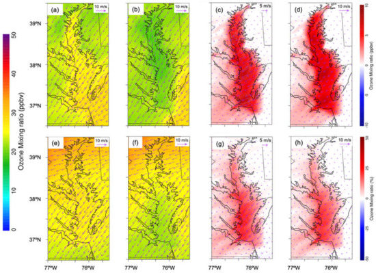 On 3 June, at night, the model-simulated O3 with water over CB was 28 ppbv, while, without water, the model-simulated O3 mixing ratio was 18 ppbv (Figure 7a,b). In the day, the model-simulated O3 with water over CB was 32 ppbv, while, without water, the model-simulated O3 mixing ratio was 25 ppbv (Figure 7c,d). The averaged surface O3 mixing ratio over CB increased by 10 ppbv (30%) at night (Figure 7c,d) and 5 ppbv (20%) during the day (Figure 7g,h). The shallow stable nocturnal boundary layer “trapped” O3 and prevented it from venting to higher altitudes at night, while the deep mixed layer lofted O3 to the free troposphere during the daytime. In the daytime, the O3 mixing ratio difference was distributed semi-homogeneously over CB, with more O3 over southern CB than northern CB (Figure 7g,h). The higher O3 increase over southern CB was due to the larger area of the water body in southern CB. The O3 mixing ratio difference increased slightly from east to west across CB, consistent with the direction of the prevailing winds. The wind difference over CB indicated wind increase due to less surface friction over the water surface than over land and contributions from bay breezes. In addition, the westward pooling of pollution created elevated O3 that extended into the Baltimore–Washington D.C. urban corridor [26]. At night, the O3 mixing ratio difference gradient gradually decreased and approached the minimum close to the eastern shore (Figure 7c,d). In the daytime, the O3 mixing ratio difference gradient had a pattern analogous to nighttime but had a smaller magnitude (Figure 7g,h).