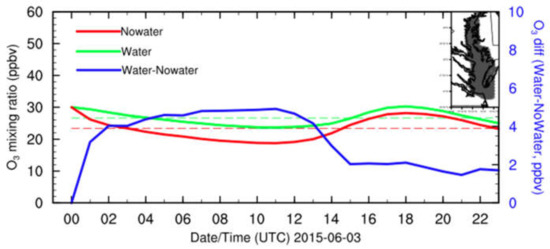 The surface O3 mixing ratio diurnal variations in both the baseline and sensitivity experiments and their differences above CB are shown in Figure 8. These show that the surface O3 mixing ratio above CB from the baseline and sensitivity experiments had a similar diurnal variation trend. The surface O3 mixing ratio at night (about 20–25 ppbv) was lower than in the daytime (about 25–30 ppbv). The larger surface O3 mixing ratio difference mean over CB occurred at night (about 5 ppbv or 25%) rather than in the daytime (about 2 ppbv or 15%) due to the longer residence time of O3 over CB at night. The wind speed over CB at night is lower than in the daytime, recorded as 8 m s−1 and 12 m s−1, respectively. At night, the residence of this higher O3 air over CB tended to be longer. In addition, O3 accumulated at the southern end of CB (and the western shore of CB) where it was more impacted, and differences would add to the chance of exceedance of O3 mixing ratio limits. In fact, Goldberg et al. (2014) indicated that over a 10-day period, ozone was exceeded four times over the water as observed on a moving ship compared to two times over land during the DISCOVER-AQ-2011 project (June–31 July 2011, [26]), while the surrounding land exceeded the NAAQS four (4) times, reinforcing the O3 increase effect due to CB, especially in the downwind region.
