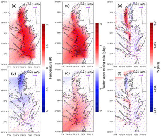WRF–Chem-simulated absolute differences (water minus nowater) in temperature (a,b), water vapor mixing ratio (c,d), and vertical velocity (e,f) between simulations of baseline (water) and sensitivity (nowater) experiments over CB overlaid with corresponding surface wind differences. The first row is at night; the second row is in the day. Daytime is defined as 1000–0000 UTC (or 06:00–20:00 local time); nighttime is defined as 0000–0900 UTC (or 00:00–06:00 and 20:00–00:00 local time).