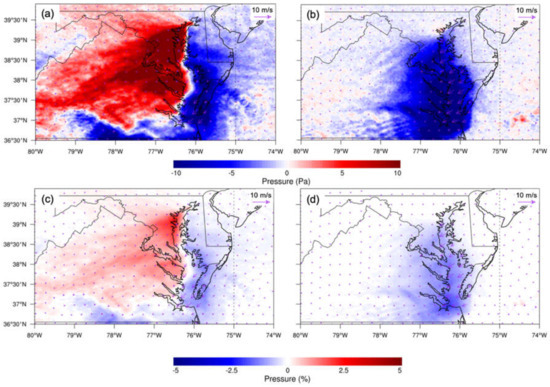 Pressure differences were observed from the baseline and sensitivity experiments. At night, the effect of CB increased the surface pressure over the western shore of northern CB, leading to the pressure gradient force pointing from west to east (Figure 10a,c). This is consistent with Goldberg et al. (2014) [26]. The pressure gradient contributed to the land breeze from the west, offshore of CB. The resulting increased land breeze blew in opposition to the northeasterly prevailing wind, minimizing the wind difference over CB due to the water body (Figure 10a,c). During the daytime, CB decreased pressure. The pressure gradient favored the prevailing wind and worked to reinforce the flow (Figure 10b,d).