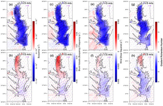 At night, the buoyancy, Brunt–Väisälä (buoyancy) frequency, wind shear squared, and gradient Richardson number decreased due to the presence of CB (Figure 11a,c,e,g). A relatively small water body surrounded by a large landmass over northern CB led to a significant thermally induced perturbation in contrast to southern CB. Relatively small surface wind differences were due to the water body and contributed to the atmospheric stability through wind shear. There was no regional preference of surface horizontal wind difference and thus its contribution to the instability was uniform over the entirety of CB (Figure 11a,c,e,g). In addition to the surface temperature increase, the vertical velocity difference was positive over northern and middle CB, which contributed to the unstable condition (Figure 10e). The critical Richardson number is 0.25. If the gradient Richardson number is less than 0.25, the atmosphere is dynamically unstable and turbulent. The gradient Richardson number difference was negative (around −1–−2) at northern CB and caused significant atmospheric instability. In the day, the surface wind differences at northern CB were smaller than at nighttime. The differences in buoyancy, Brunt–Väisälä (buoyancy) frequency, wind shear squared, and gradient Richardson number remained negative at southern CB and shifted to positive values at northern CB (Figure 11b,d,f,h). Contrary to the night, CB increased the gradient Richardson number in the day at northern CB, leading to the stable condition.