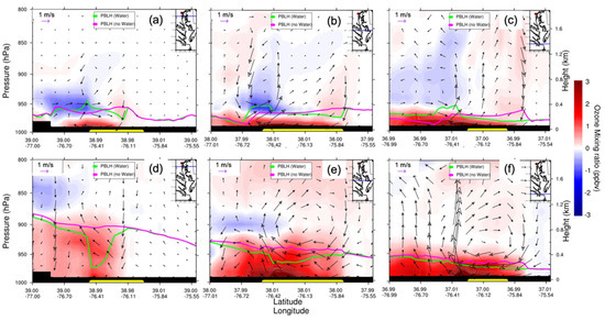 WRF–Chem-simulated O3 mixing ratio vertical cross section (from west to east) differences (water minus nowater, night: (a–c); day: (d–f)). The overlaid streamline is the corresponding surface wind difference. The green curve is the PBLH of water; the pink curve is the PBLH of nowater; CB is represented by the yellow bar. The upright insert map shows the location of the vertical cross section (blue line). Note that vertical wind is magnified by 50 times for the illustration. Daytime is defined as 1000–0000 UTC (or 06:00–20:00 local time); nighttime is defined as 0000–0900 UTC (or 00:00–06:00 and 20:00–00:00 local time).