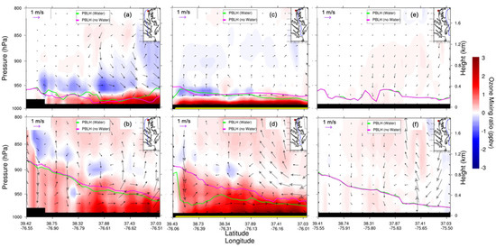 WRF–Chem-simulated O3 mixing ratio vertical cross section (from north to south) differences (water minus nowater, night: (a,c,e); day: (b,d,f)). The overlaid streamline is the corresponding surface wind difference. The green curve is the PBLH of water; the pink curve is the PBLH of nowater. CB is denoted with the yellow bar. Note that vertical wind is magnified by 50 times for illustration purposes. Daytime is defined as 1000–0000 UTC (or 06:00–20:00 local time); nighttime is defined as 0000–0900 UTC (or 00:00–06:00 and 20:00–00:00 local time).