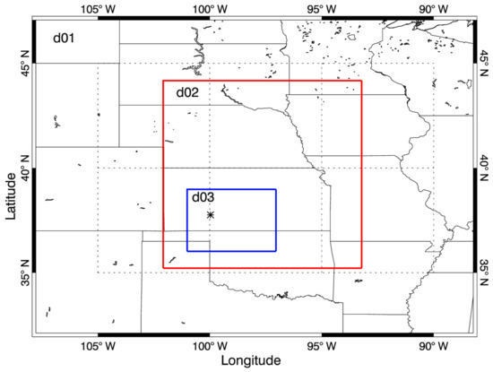 The WRF model outputs were saved every 5 min and were used as inputs for the radar forward operator. In this paper, the result focused on the simulation for the innermost domain. The radar operator was applied for all horizontal grids and for vertical levels from the lowest to the highest levels. Polarimetric variables were simulated for the S-band WSR-88D radar KDDC (the black star in Figure 2, 99.969° W in longitude, 37.761° N in latitude, and 813 m in altitude) in Dodge City, KS.
