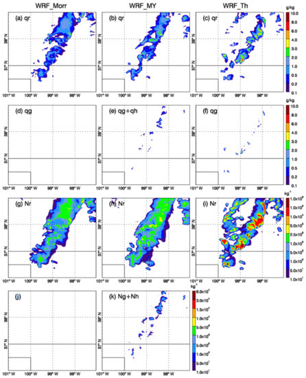 Mixing ratio of rainwater (a–c) and graupel or hail (d–f) for WRF_Morr, WRF_MY, and WRF_Th, respectively. Total number concentration of rainwater (g–i) for WRF_Morr, WRF_MY, and WRF_Th, respectively. Graupel or hail number concentration for (j) WRF_Morr and (k) WRF_MY. All plots are for the fields at 2345 UTC 29 May 2018 at 1 km altitude.