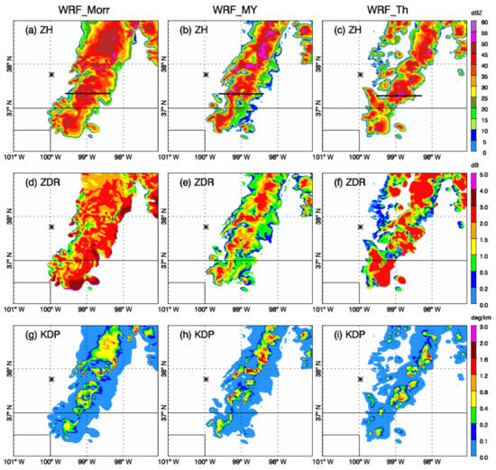 ZH (a–c), ZDR (d–f), and KDP (g–i) for WRF_Morr, WRF_MY, and WRF_Th, respectively. All plots are for the fields at 2345 UTC 29 May 2018 at 1 km height. The black star shows the location of the KDDC radar. The black lines show the location of the cross-section discussed in Section 3.3.