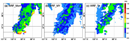 where is the air density and is density of liquid water, qr is rainwater mixing ratio, and NTr is the total number concentration of rain droplets. As shown in Figure 6, the overall pattern of MMDr at 1 km height generally agreed with ZDR shown in Figure 5d–f. For example, rain particles WRF_Morr showed the diameter as large as 0.8 mm over the southern end of the storm near 36.4° N, 99.4° W where the ZDR value was larger than 3 dB. WRF_MY had rain hydrometeors with MMDr generally lower than 0.2 mm except for the convective core regions, corresponding to the lower ZDR values (Figure 5e). For the Thompson scheme, MMDr was uniformly 0.2–0.3 mm for rainy areas which may explain ZDR values of 2–3 dB spreading over the region (Figure 5f).