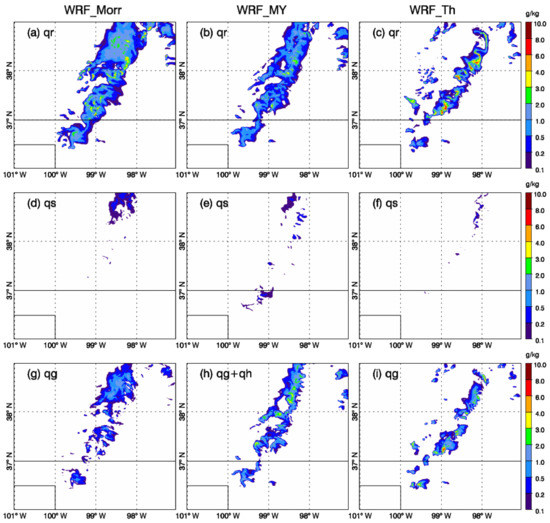 Mixing ratio of rainwater (a–c), snow (d–f), and graupel and/or hail (g–i) for WRF_Morr, WRF_MY, and WRF_Th, respectively. All plots are for the fields at 2345 UTC 29 May 2018 at 3 km height.
