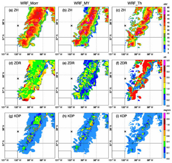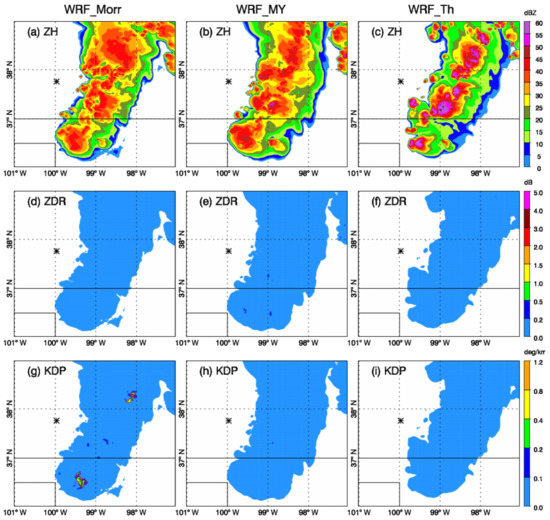 ZH (a–c), ZDR (d–f), and KDP (g–i) for WRF_Morr, WRF_MY, and WRF_Th, respectively. Red contour lines in KDP plot show the rain water mixing ratio of 0.5 g kg−1. All plots are for the fields at 2345 UTC 29 May 2018 at 8 km height. The star signs in the plots show the location of the KDDC radar.