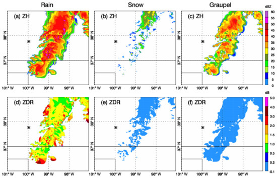 ZH in (a–c) and ZDR in (d–f) from WRF_Morr contributed by rain, snow, and graupel, respectively. All plots are for 2345 UTC 29 May 2018 at 3 km height. The star signs in the plots show the location of the KDDC radar.