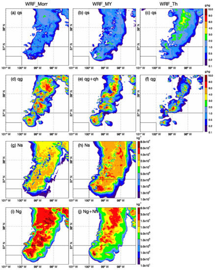 Mixing ratios of snow (a–c) and graupel and/or hail (d–f) for WRF_Morr, WRF_MY, and WRF_Th, respectively. Total number concentrations of snow (g–h) and graupel and/or hail (i,j) for WRF_Morr and WRF_MY, respectively. All plots are for the fields at 2345 UTC 29 May 2018 at 8 km height.
