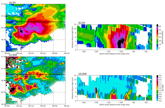 (a) ZH and (c) ZDR at 1 km height collected by KDDC radar at 2321 UTC 29 May 2018. Vertical cross-section of (b) ZH and (d) ZDR along the longitude of 99.34° W.