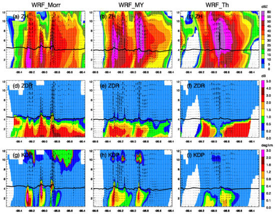 Vertical cross-sections of ZH in (a–c), ZDR in (d–f), and KDP in (g–i) for WRF_Morr, WRF_MY, and WRF_Th, respectively. Vertical cross-sections are plotted along the black lines shown in Figure 5a–c. The vectors are vertical velocity and the black curves show the height of the 0 °C isotherms. The red contours in the upper level of (g–i) show KDP of 0.2 deg km−1 from rain water only.