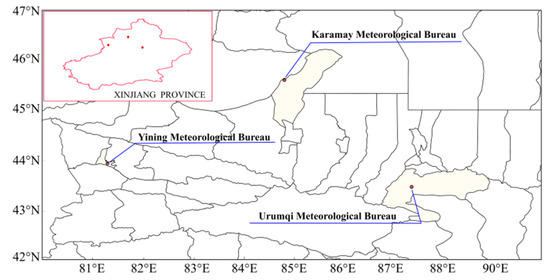 Urumqi, Karamay and Yining are important cities located in the economic belt on the northern slope of Tianshan Mountain, with a temperate continental climate. Urumqi, the capital of the Xinjiang Uygur Autonomous Region, is surrounded by mountains on three sides and an open plain in the north. The annual mean temperature is 6.4 °C and the annual precipitation is 236 mm. Yining is located in the northwest of Xinjiang and the middle of the Ili River Valley, known as “a place with South-China-type scenery”. The annual mean temperature is 10.5 °C, and the annual precipitation is 297 mm. Karamay is located in the west of Junggar Basin. The terrain is inclined strip, long from north to south, narrow from east to west, dry and rainless. The annual mean temperature is 8.6 °C, and the annual precipitation is 109 mm. The observation points of the three cities are located at Urumqi national basic meteorological station (87.39° E, 43.47° N, altitude 935.9 m), Karamay national basic meteorological station (84.85° E, 45.62° N, altitude 452.8 m) and Yining national reference climate station (81.33° E, 43.95° N, altitude 663.4 m) (Figure 1).