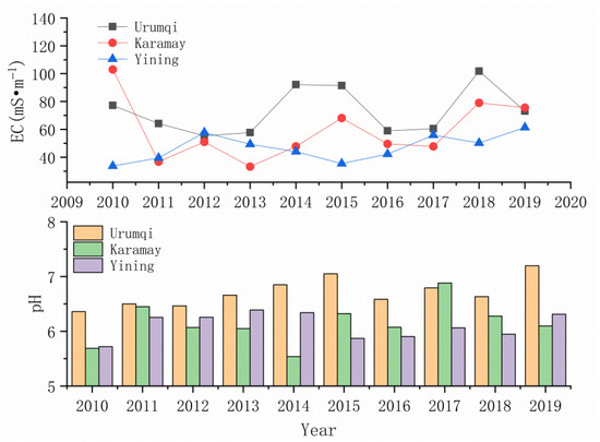 The volume-weighted mean pH and EC of the precipitation in Urumqi, Karamay and Yining from 2010 to 2019.