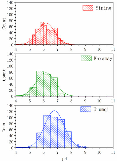 Frequency distribution of pH for Urumqi, Karamay and Yining.