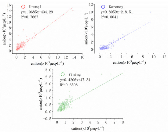 Ion balance refers to the balance between the sum of cation charge and anion charge in a solution. If the chemical components of precipitation are determined comprehensively, the sum of the final equivalent concentrations of cations must be equal to the sum of the equivalent concentrations of anions. Based on this, the equivalent concentrations of anions and cations in precipitation can be calculated respectively to check whether major ions are omitted. The ideal state is: Σ cation = Σ anion (Σ cat = Σ an). In this study, Σ cat = [Ca2+] + [Mg2+] + [Na+] + [K+] + [H+] + [NH4+], Σ an = [SO42−] + [NO3−] + [Cl−] + [F−]. It is generally believed that when pH > 5.6, the contribution of HCO3− to anions cannot be ignored. The higher the pH is, the greater the contribution HCO3− makes [28]. After rejecting the data that has not met the quality criteria, linear regression analysis was performed between the grand total concentration of anions and cations in precipitation for each region, respectively. Strong correlations were obtained between the sum of anions and the sum of cations in each case, and the R2 values were 0.77, 0.80 and 0.65 for Urumqi, Karamay and Yining, respectively (Figure 4). HCO3− and PO43− were not determined in this study, and there were still a variety of organic acids in precipitation, all of which may be an important reason for the imbalance of the total concentration of cations and anions. In addition, different air pollution properties and ion sources will also affect the balance of the total concentration of cations and anions.