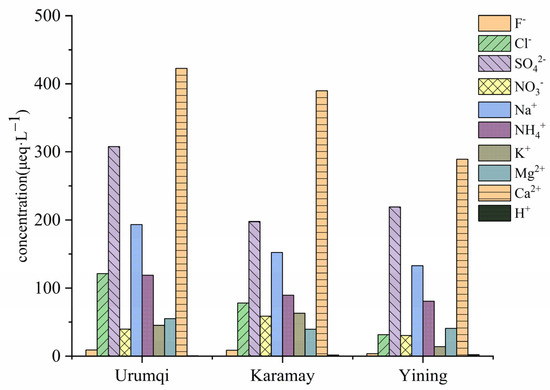 To evaluate the ionic composition of precipitation, the volume-weighted mean along with statistical analysis was analyzed in the study area of three cities. Figure 5 shows the volume-weighted mean concentration of ionic components in the precipitation of three cities. The orders of ion concentration in precipitation in the three cities are different, with the order Ca2+ > SO42− > Na+ > Cl− > NH4+ > Mg2+ > K+ > NO3− > F− in Urumqi, Ca2+ > SO42− > Na+ > NH4+ > Cl− > K+ > NO3− > Mg2+ > F− in Karamay and Ca2+ > SO42− > Na+ > NH4+ > Mg2+ > Cl− > NO3− > K+ > F− in Yining. Among the analyzed cations and anions, Ca2+ and SO42- presented the highest volume-weighted mean concentrations in the three stations. The average concentrations of Ca2+ were 32.15%, 36.10% and 34.21% in Urumqi, Karamay and Yining, respectively. Compared with the other two cities, Karamay had the highest proportion of Ca2+, indicating that Karamay has more dust. Compared with Urumqi and Karamay, the proportion of SO42− in the precipitation in Yining was the highest, accounting for 23.41%, 18.31% and 25.93% in Urumqi, Karamay and Yining, respectively. The proportions of NO3− in precipitation were low in the three cities.