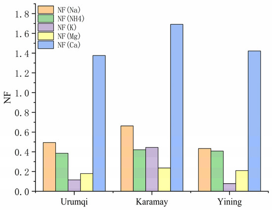 The acidity of precipitation depends on the concentration of acidogenic precursors and neutralizing ions. The acidity of precipitation in most parts of the northern hemisphere is mainly caused by strong acids H2SO4 and HNO3 and organic acids. SO42− and NO3− are usually used as the main acidogenic ions [32]. Previous studies have shown that in the cloud, Ca (OH)2 and Mg (OH)2 neutralize with condensate H2SO4 and HNO3, while under the cloud, ammonia neutralizes with SO2 adsorbed on suspended particles containing Ca2+ and Mg2+ [20,33]. H+ concentration reflects the acidity of raindrops neutralized by Ca2+ and NH4+ [34], and the relative acidity (FA) is an index to evaluate the neutralization degree of precipitation acidity [20]. In this study, the FA values of precipitation were 0.002, 0.006 and 0.01 in Urumqi, Karamay and Yining, respectively, indicating that 99.8%, 99.4% and 99% of precipitation acidity was neutralized by alkaline components in Urumqi, Karamay and Yining. Multi-annual mean values of the neutralization factors (NFs) of three cities were shown in Figure 6. NFs below 1 indicate that acidic substances have a significant effect on neutralizing substances. It can be seen that Ca2+ had the highest neutralization capacity of precipitation in the three cities, with an average value of 1.69 in Karamay, 1.38 in Urumqi and 1.42 in Yining, respectively, being followed by Na+ and NH4+. The other ions, such as K+ and Mg2+, did not have obvious effect in neutralizing the rainwater acidity. The difference between Karamay and the other two stations was that the value of NF (Mg2+) is higher than NF (K+).