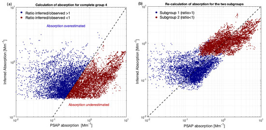 Inferred absorption coefficient (y-axes) versus observed absorption coefficient (PASP) (x-axes) for cluster group 4 ‘Polluted’: (a) Data points are separated according to ratio inferred/observed absorption, where data points with ratios > 1 are presented in blue and data points with ratios < 1 are presented in red. The dashed line shows the identity line; (b) Presentation of inferred (calculated) versus observed (PSAP) absorption after recalculation of the dataset based on ratios for data pairs belonging to cluster group 4 as seen in (a).