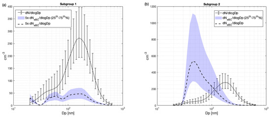 Comparison between observed particle size distributions (black solid) and inferred (black dashed) distributions assuming external mixtures for Subgroup 1 (a) and Subgroup 2 (b). For Subgroup 1, the inferred is multiplied with the factor 5 to show the distribution shape more clearly. The blue shaded area and error bars represents the lower and upper quartiles of the distributions.