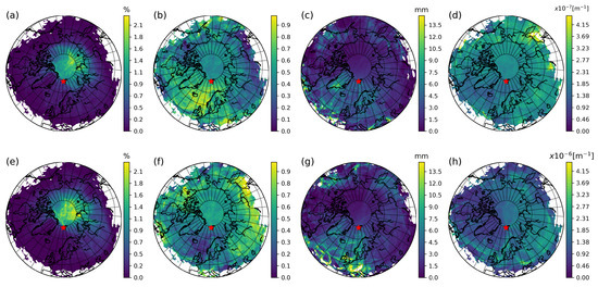 For the ‘Polluted’ cluster group in the first row, the parameters are shown for the first Subgroup 1 and in the second row in the same order for the second Subgroup 2. The red star marks the location of Zeppelin Observatory. The transport probability function P [%] (a,e); the ratio transport function R (b,f); accumulated precipitation [mm] (c,g); and the absorption coefficient at Zeppelin in [] (d,h). The absorption coefficient corresponds to the eBC concentration via the constant MAC value. Note the magnitude for the absorption coefficient is stated above the colorbar.