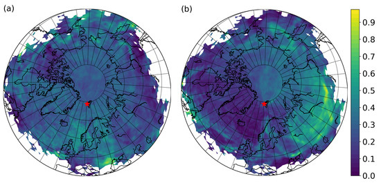 Normalised effective potential source contribution S of absorption for (a) Subgroup 1 and (b) subgroup 2. The red star marks the location of Zeppelin Observatory.
