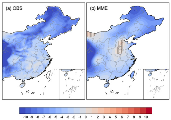 Differences between the relative threshold and the absolute threshold (35 °C): (a) Observations and (b) MME. The vertical-line areas indicate values greater than zero.