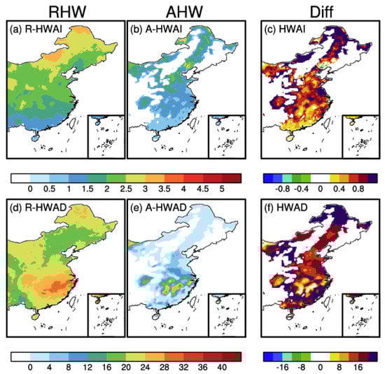 Observed heatwave indicators averaged for present-day (1995–2014). RHW (a,b) and AHW (d,e) represent the results calculated by the relative and the absolute thresholds. Diff (c,f) is the result of RHW minus AHW. The units for HWAI and HWAD are °C and days, respectively. The HWAI and HWAD of RHW are represented by R-HWAI and R-HWAD, and the HWAI and HWAD of AHW are represented by A-HWAI and A-HWAD.