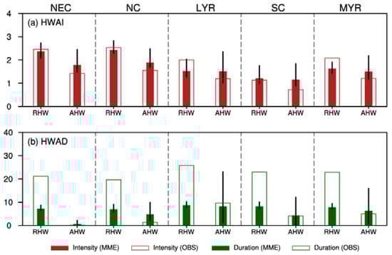 Regional mean heatwave indicators of each sub-region for the present-day: (a) HWAI (°C) and (b) HWAD (days). RHW and AHW represent the results calculated by the relative and absolute thresholds, respectively. Colored and white bars represent the MMEs and observations. The perpendicular black lines at the top of the bars represent the variation between the 10th and 90th percentiles of the multi-model ensemble. NEC, NC, LYR, SC and MYR denote Northeast China, North China, Lower Yangtze River, South China and Middle Yangtze River, respectively.