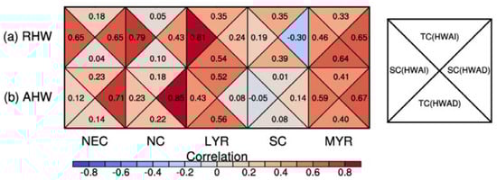 Temporal (TC) and spatial correlations (SC) between the observations and MME simulations for the present-day. (a) represents the results for R-HWAI and R-HWAD, while (b) represents the results for A-HWAI and A-HWAD. The triangles in each grid cell represent the TC (HWAI), TC (HWAD), SC (HWAI) and SC (HWAD), respectively. A value greater than 0.42 implies statistical significance at the 0.05 level.