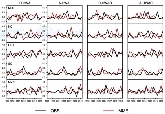 Standardized time series of R-HWAI, A-HWAI, R-HWAD, and A-HWAD from 1995 to 2014 for five sub-regions in EC. Black and red solid lines indicate the observations and MME.