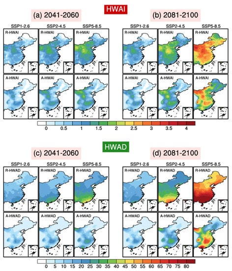 Spatial patterns of future changes for 2041–2060 (a,c) and 2081–2100 (b,d) relative to present-day. R-HWAI (°C) and R-HWAD (days) are for RHW, while A-HWAI (°C) and A-HWAD (days) are for AHW.
