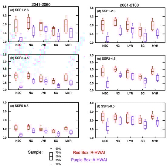 Regional mean future changes in HWAI (°C) relative to present-day for 2041–2060 and 2081–2100 under SSP1-2.6 (a,d), SSP2-4.5 (b,e) and SSP5-8.5 (c,f). The red box and purple box indicate R-HWAI and A-HWAI, respectively. The box whisker plots are the 10th, 25th, 50th, 75th and 90th intervals.