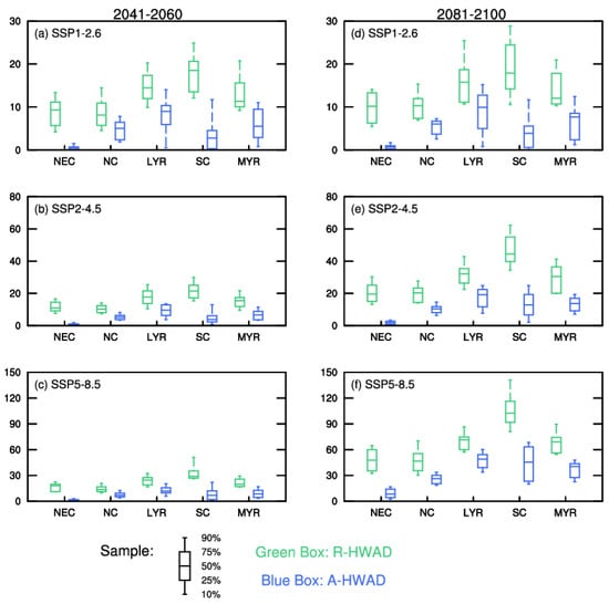 Regional mean changes in HWAD (days) relative to present-day for 2041–2060 and 2081–2100 under SSP1-2.6 (a,d), SSP2-4.5 (b,e) and SSP5-8.5 (c,f). The green box and blue box indicate R-HWAD and A-HWAD, respectively. The box whisker plots are the 10th, 25th, 50th, 75th and 90th intervals.